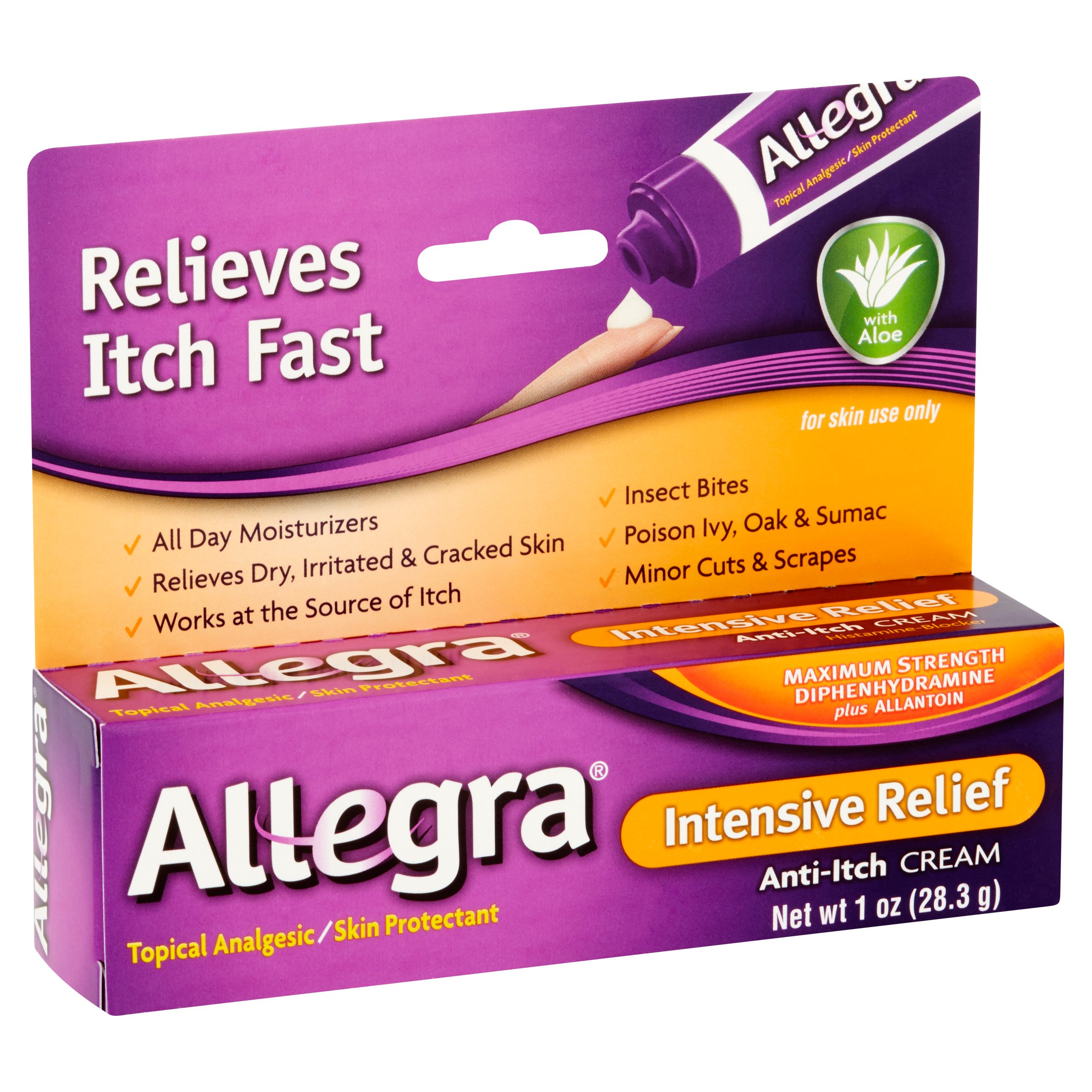 Maximum strength diphenhydramine plus allantoin. In addition the moisturizers and vitamins A C and E in Allegra Anti-Itch Cream help soothe the skin and the allantoin protects the skin while it gets back to normal after scratching. Relieves dry irritated and cracked skin with moisturizing and soothing aloe.